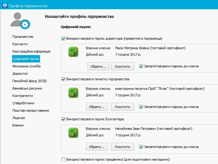 Потім для кожного обраного підпису натисніть кнопку "Обрати" та вкажіть відповідний файл ключа. Важливо не переплутати ключі різних типів підпису, що мають однакову назву. Для кожного підпису також вкажіть пароль до ключа. Кнопка "Очистити" стирає дані ключа та пароля.